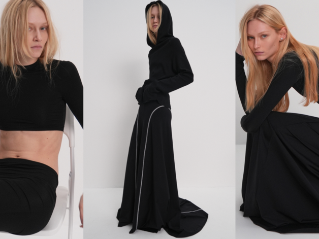 Женщина Гоши Карцева — это та, которая не нуждается в ярких деталях, чтобы заявить о себе. Она уверена в себе настолько, что может позволить себе быть минималистичной. Первая коллекция называется «черновик» — и это не просто название. Она вдохновлена представлениями о будущем, которые рисовали режиссеры 90-х и нулевых. Четкие геометричные линии, ограниченная палитра — черный и, изредка, серый. Зачем отвлекать взгляд, если можно сосредоточиться на силуэте? На целом образе. На том, как одежда становится частью тебя.
