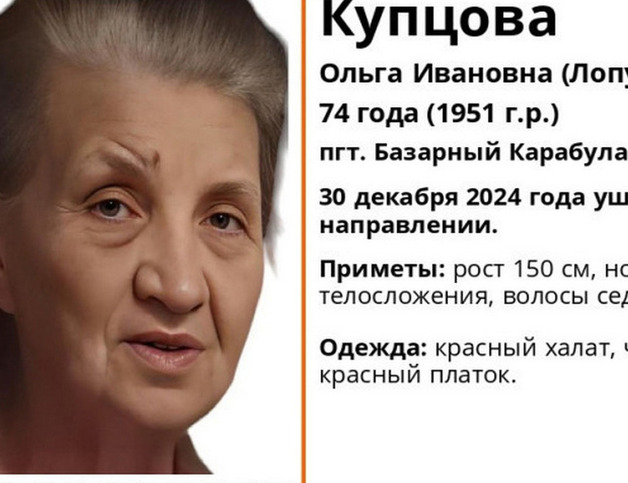 В Базарном Карабулаке Саратовской области исчезла 74-летняя Ольга Купцова в легкой одежде. Она пропала 30 декабря и может нуждаться в медицинской помощи из-за проблем с памятью.